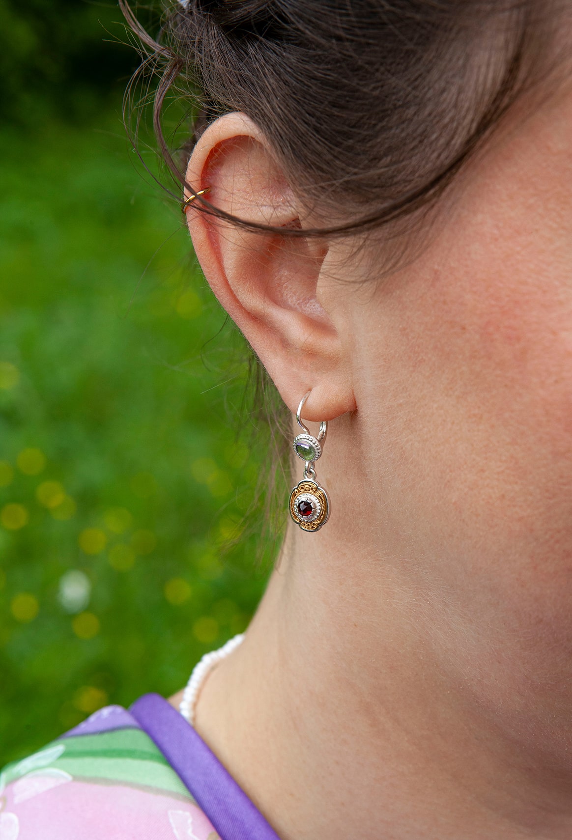 Zarte Ohrhänger, zweifärbig, aus hellem Silber, mit filigraner Auflage in Silber-vergoldet und kleinem Granat in der Mitte.